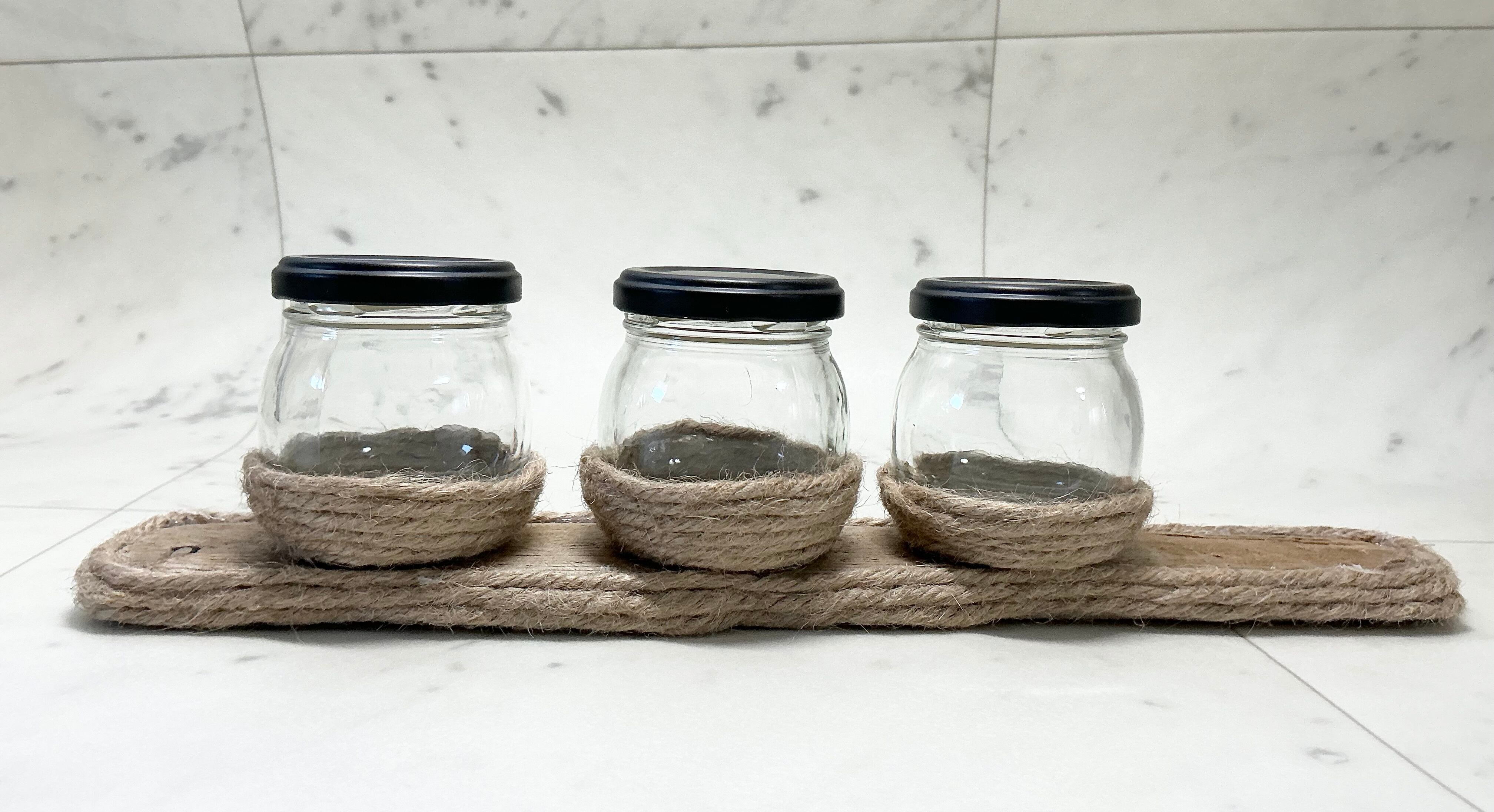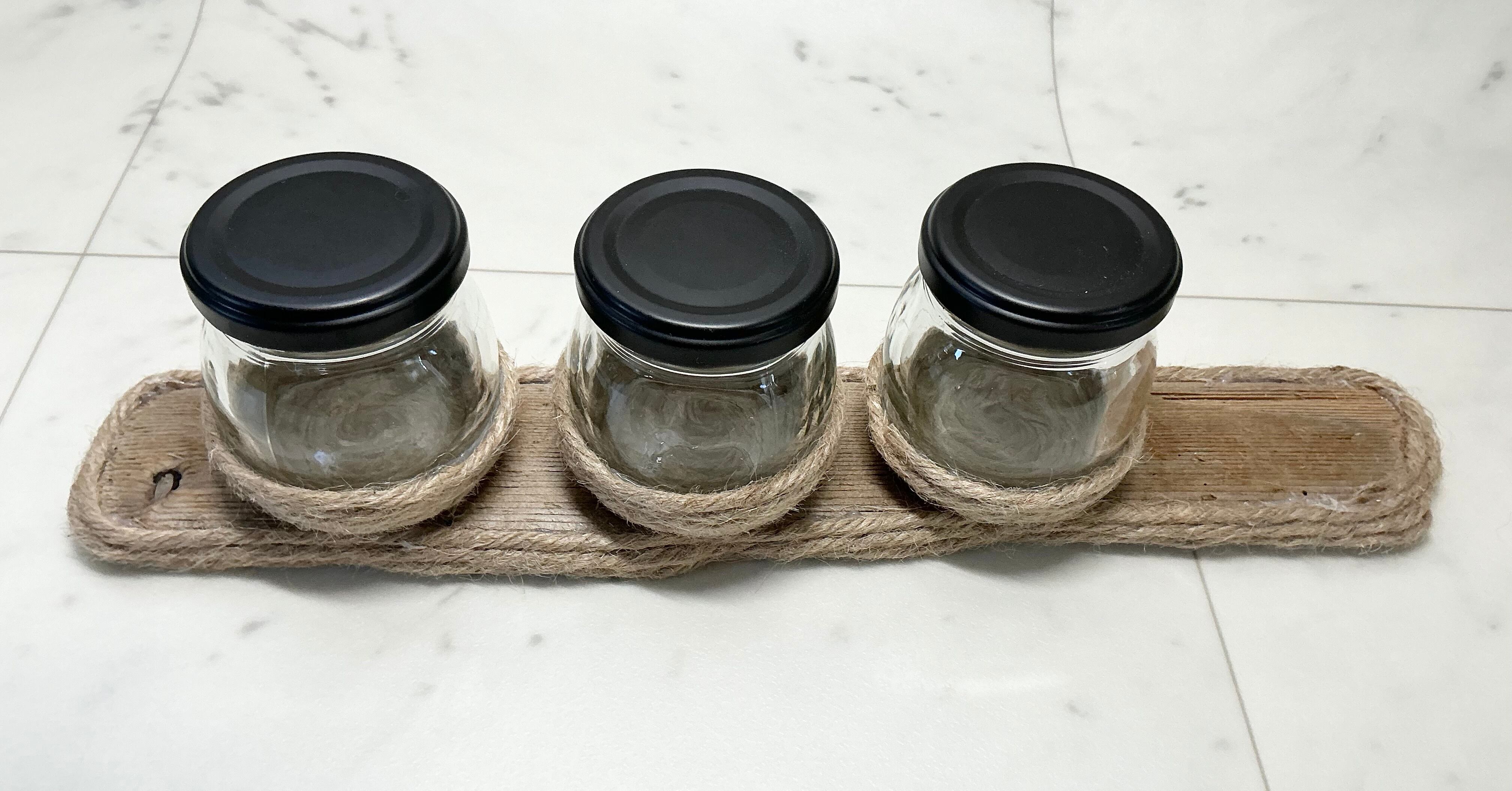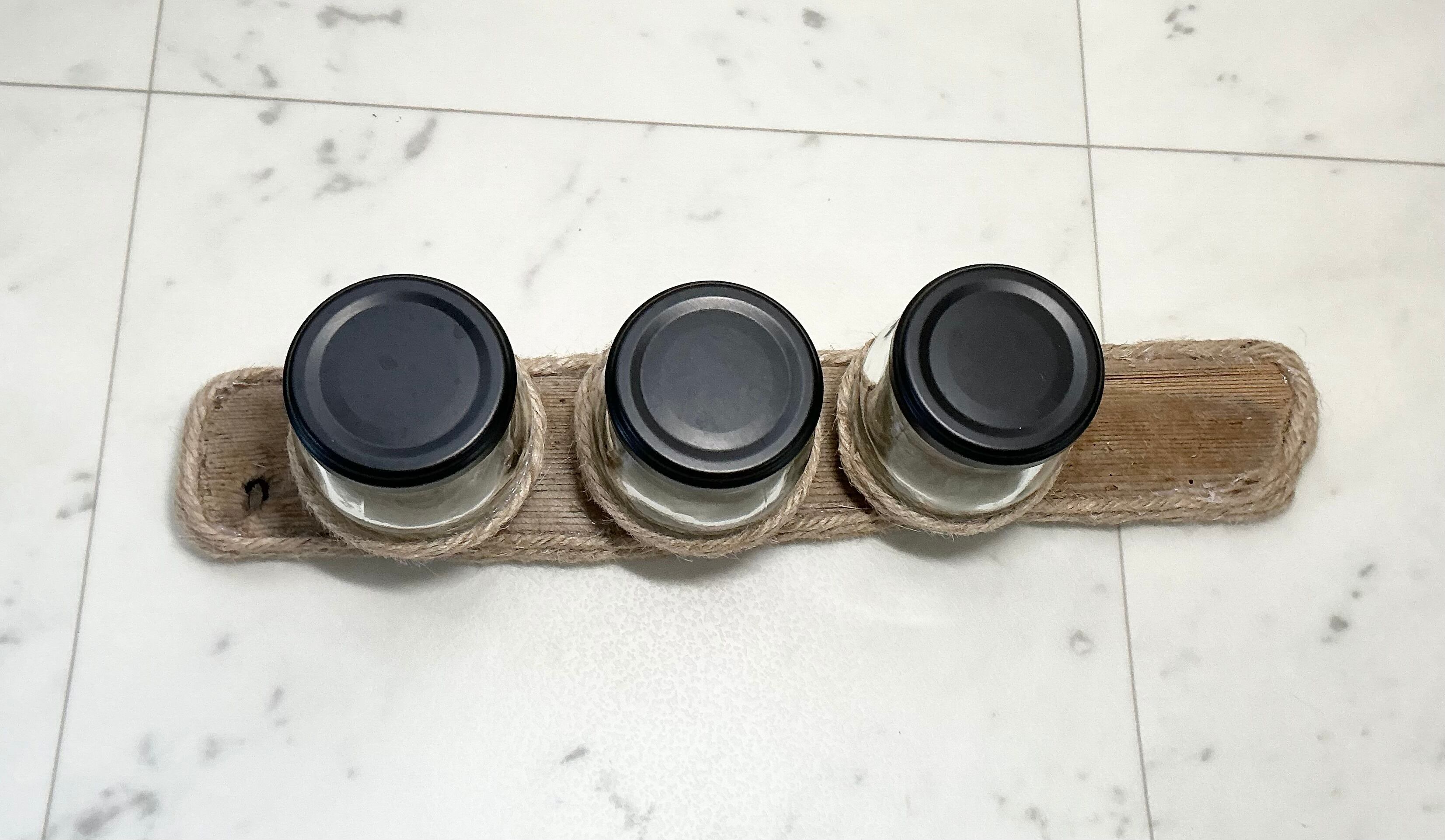 瓶を麻紐で巻き 3つ乗せました