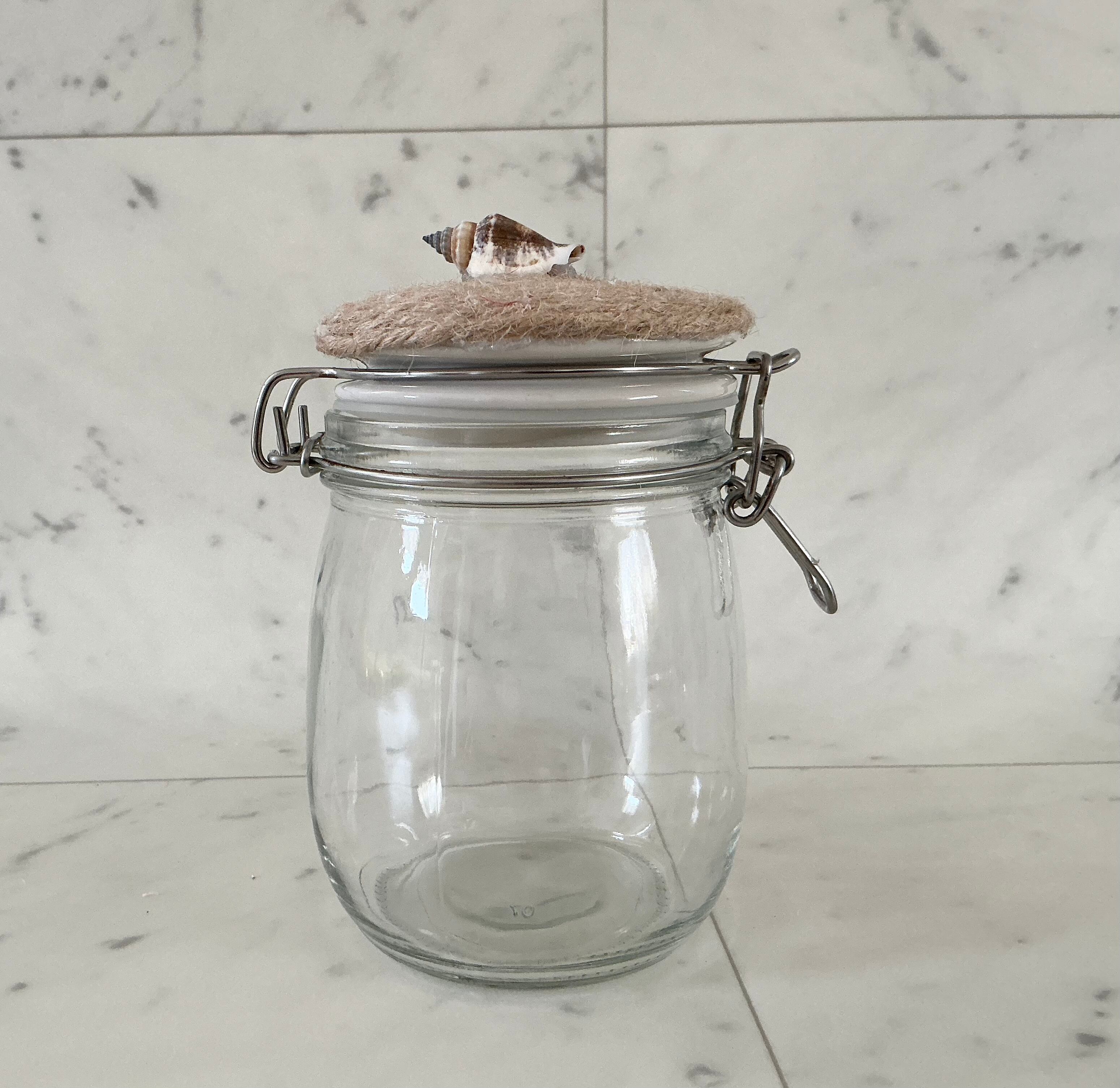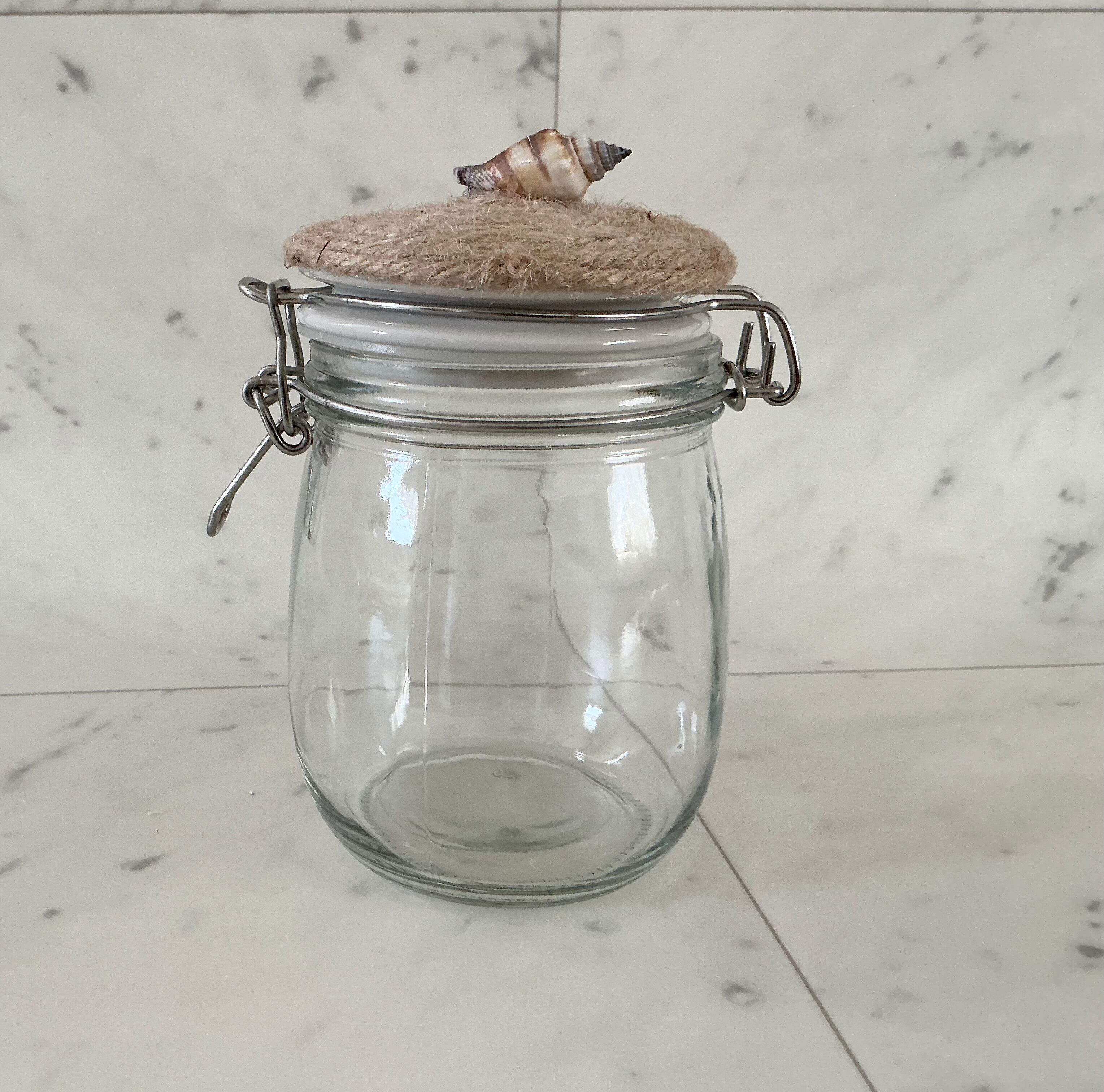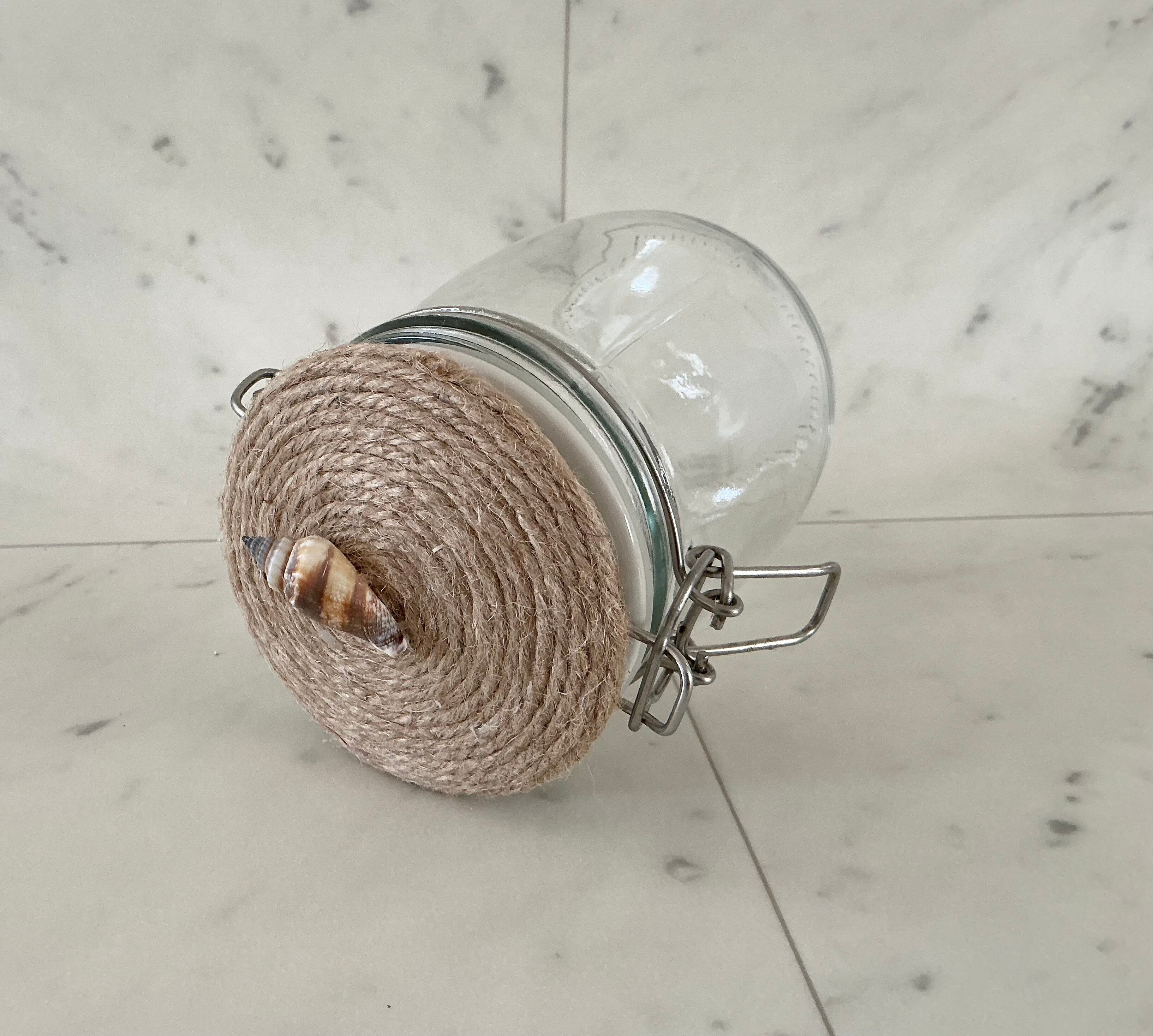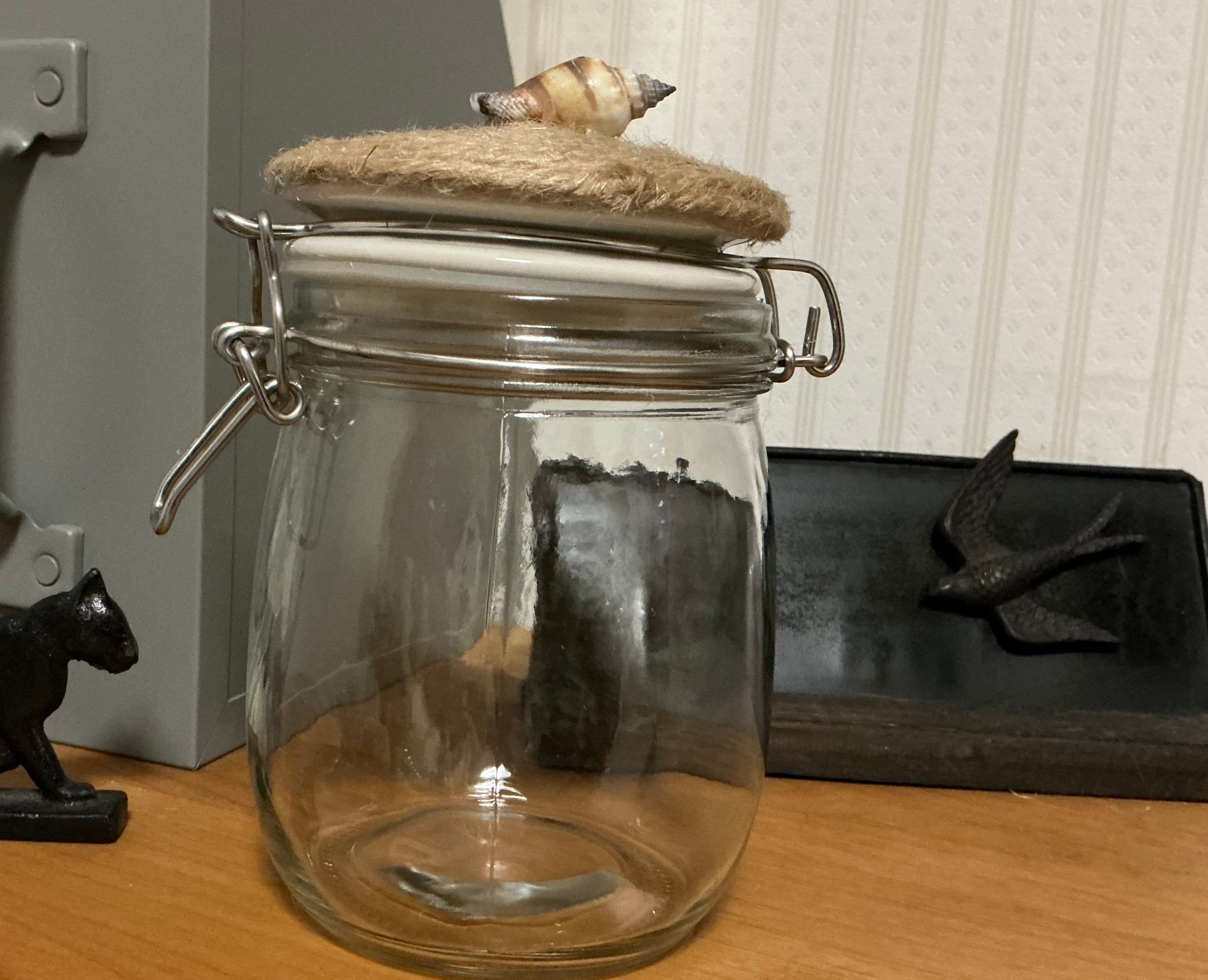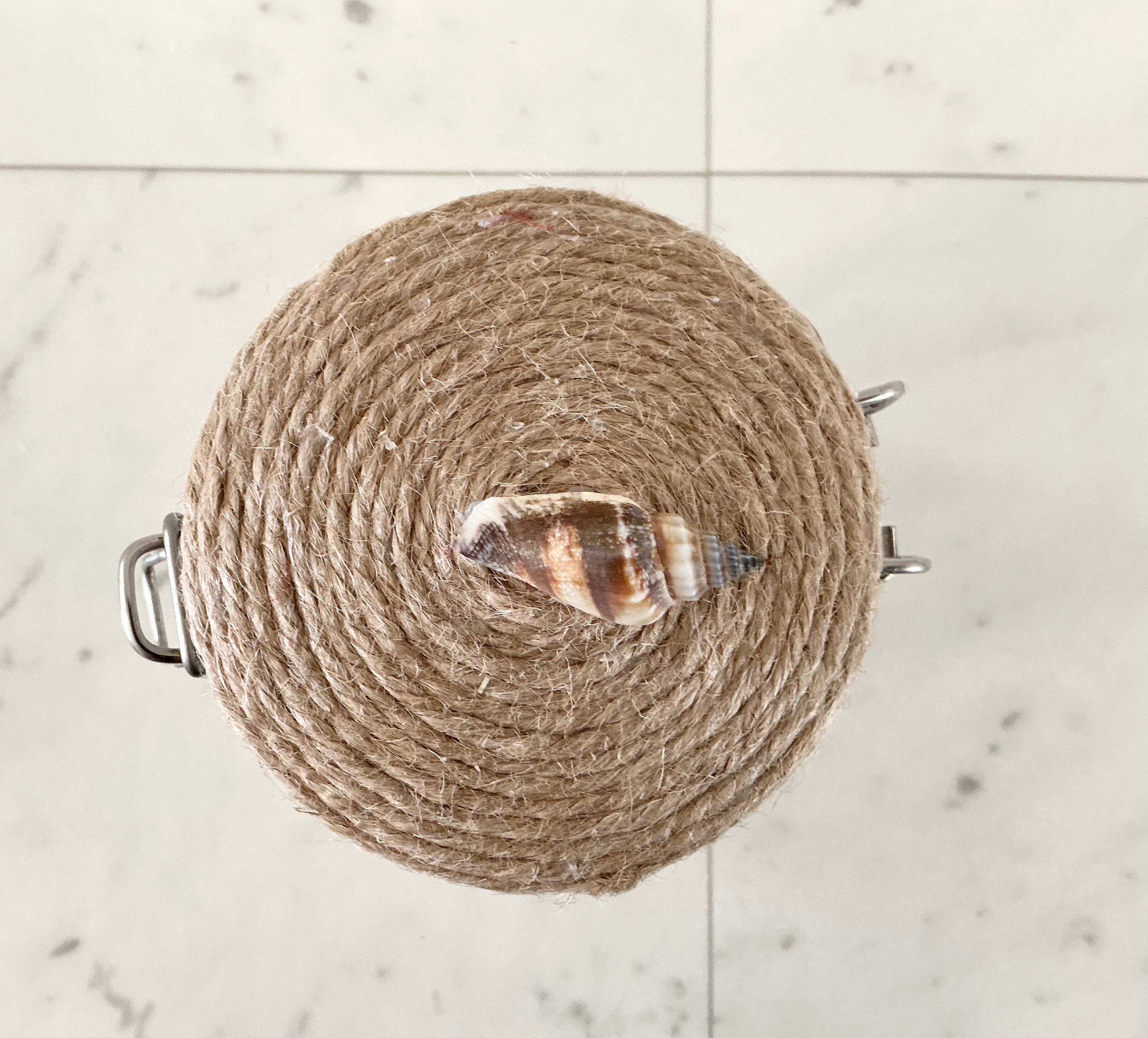 蓋上部に麻紐を巻き上に貝殻を付けました